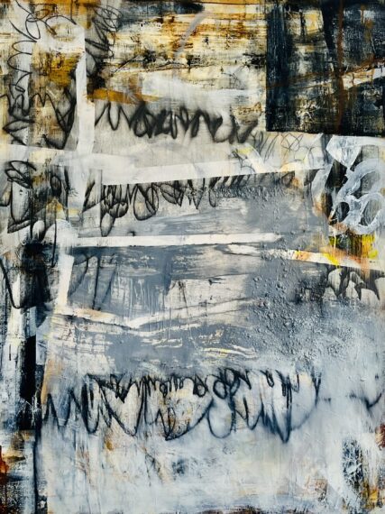 Working on several pieces at a time, I feel like an explorer who loves building layers by painting and drawing, scraping back and adding more. In the process I discover marks, new tools and new fragments of myself.