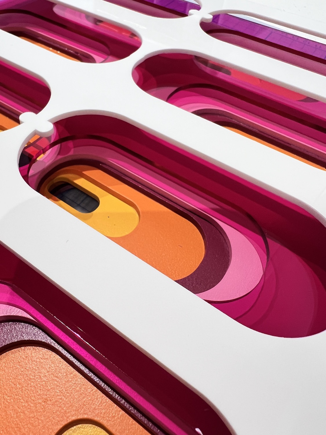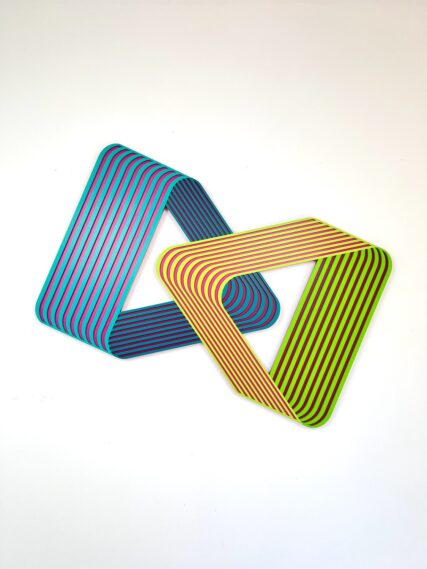 Deepening her inquiry into geometric abstraction, her work plays with form, colour and illusion. Combining digital and analogue practices, she creates 3D wall-hanging sculptures that manipulate perception and produce senses of movement.