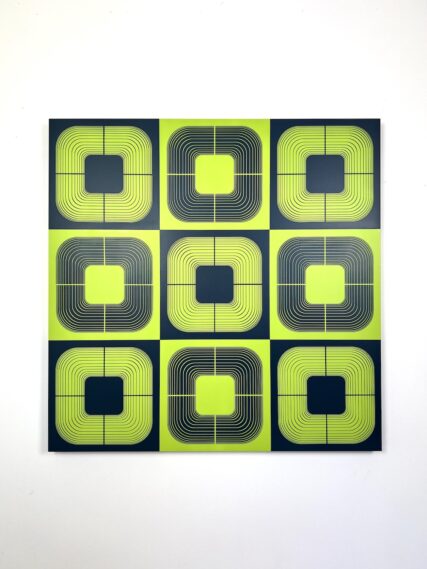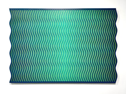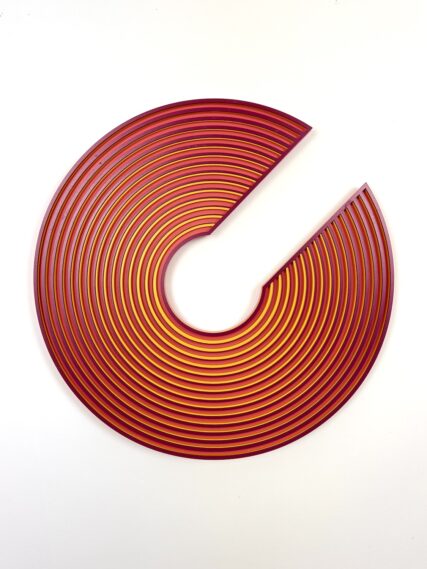 Deepening her inquiry into geometric abstraction, her work plays with colour and illusion. Combining digital and analogue practices, she creates 3D wall-hanging paintings that manipulate perception and produce senses of movement.