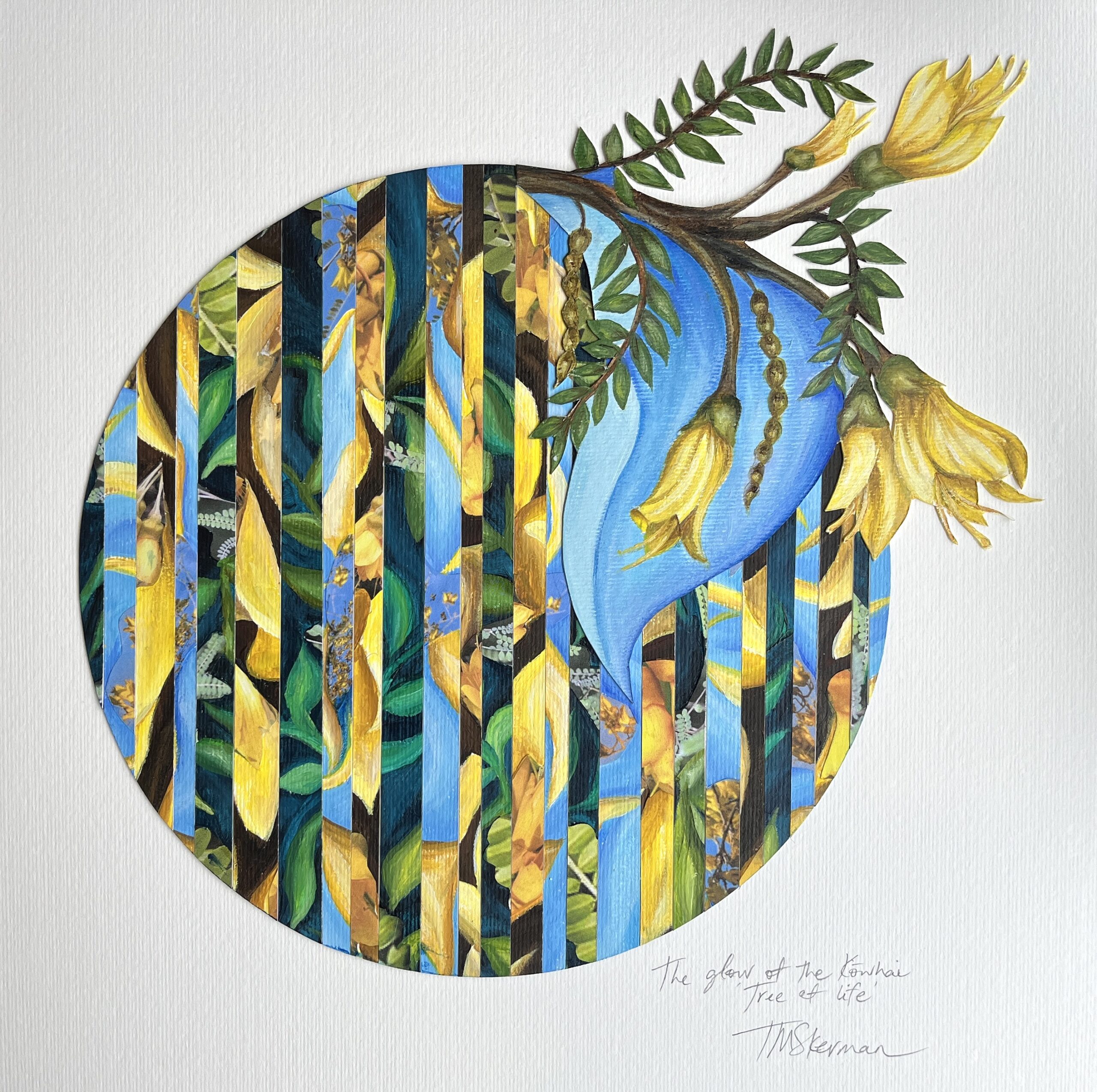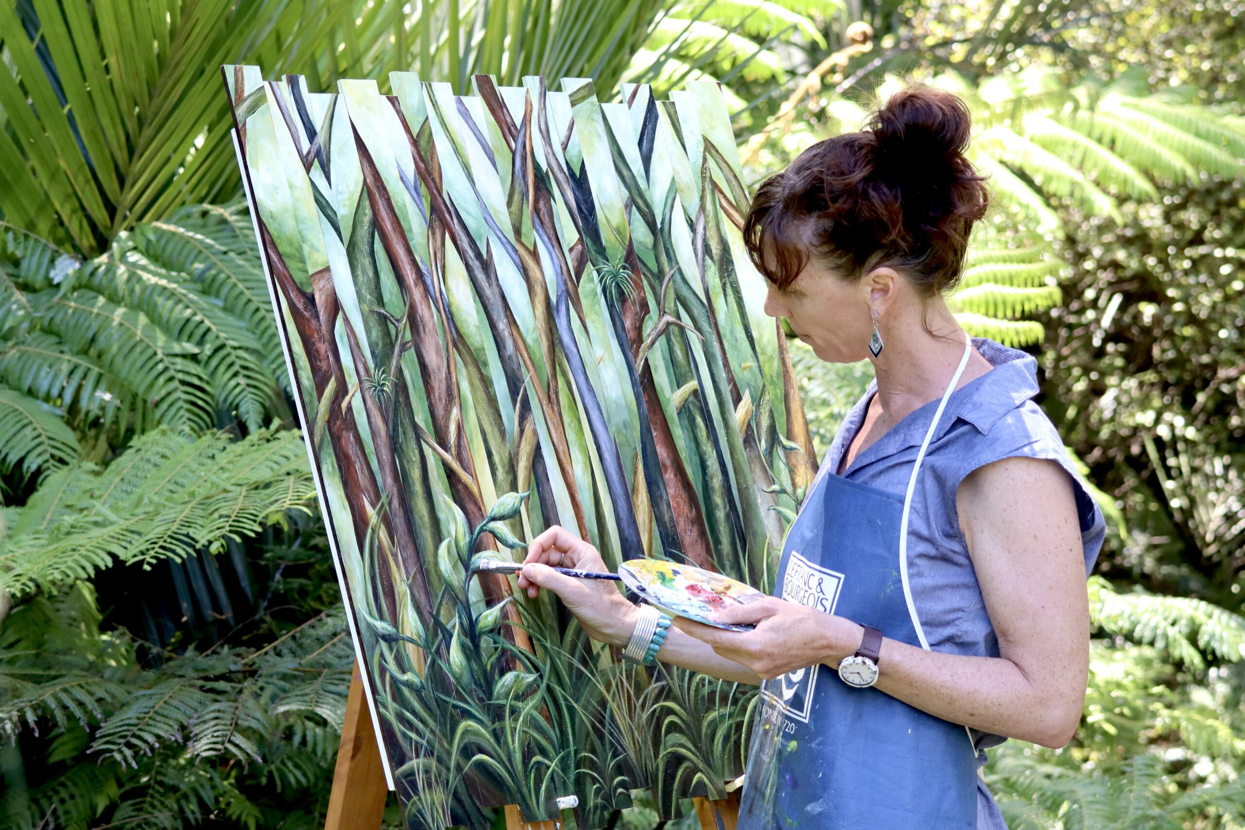 Her aptly named “slat painting” style draws inspiration from the natural world—particularly the surrounding bush and landscapes encountered through travel. Through this process of fragmentation and reconstruction, Tessa explores the layered and shifting ways we experience nature. Developed over more than a decade of experimentation, the technique reflects her ongoing curiosity and desire to reinterpret the visual fragments that shape our perception of place.